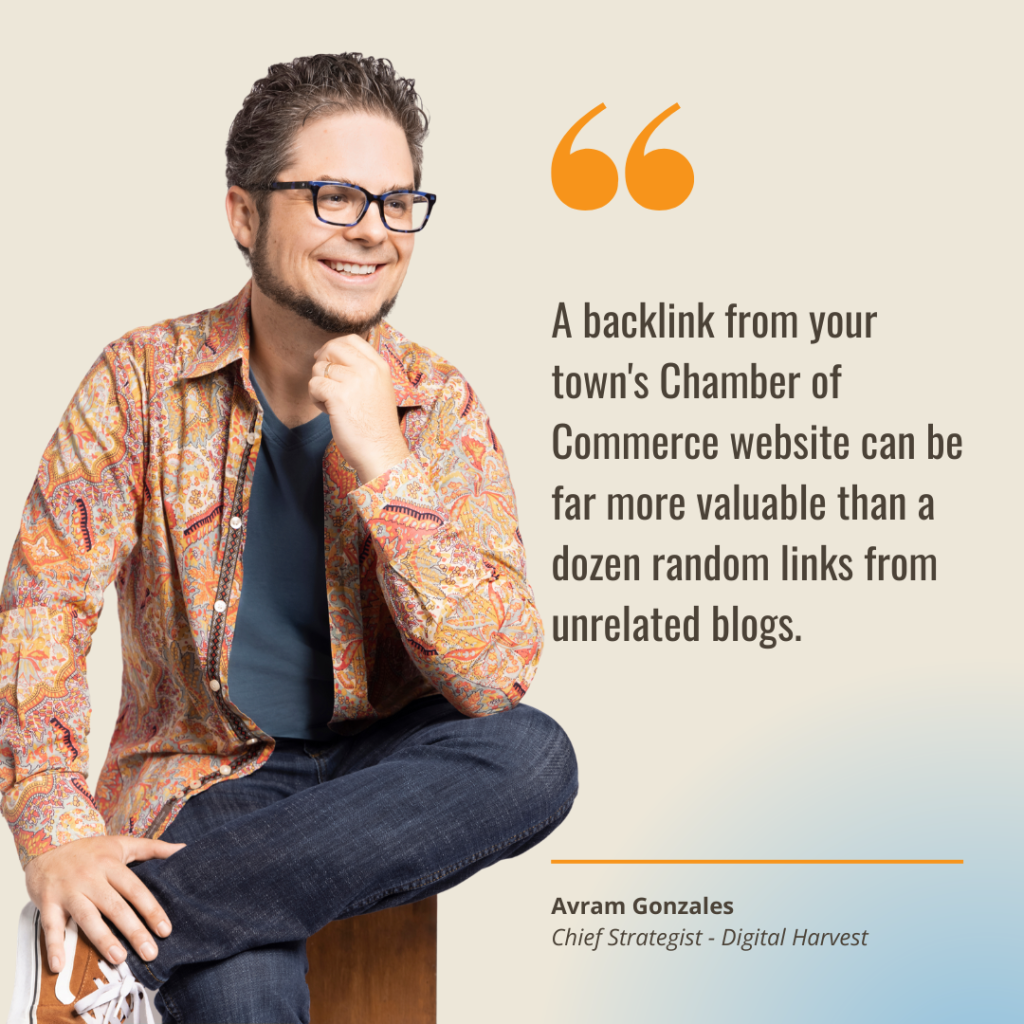 “A backlink from your town’s Chamber of Commerce website can be far more valuable than a dozen random links from unrelated blogs.”