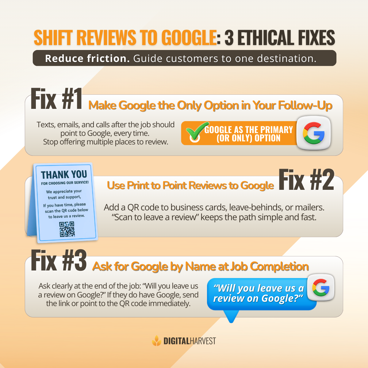 The fix is not more reminders. The fix is a better system. Make Google the primary option, reduce friction so reviews take only a few seconds, and guide the person clearly at the end of the job.